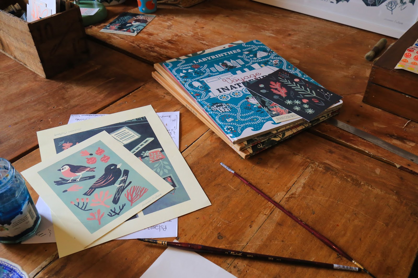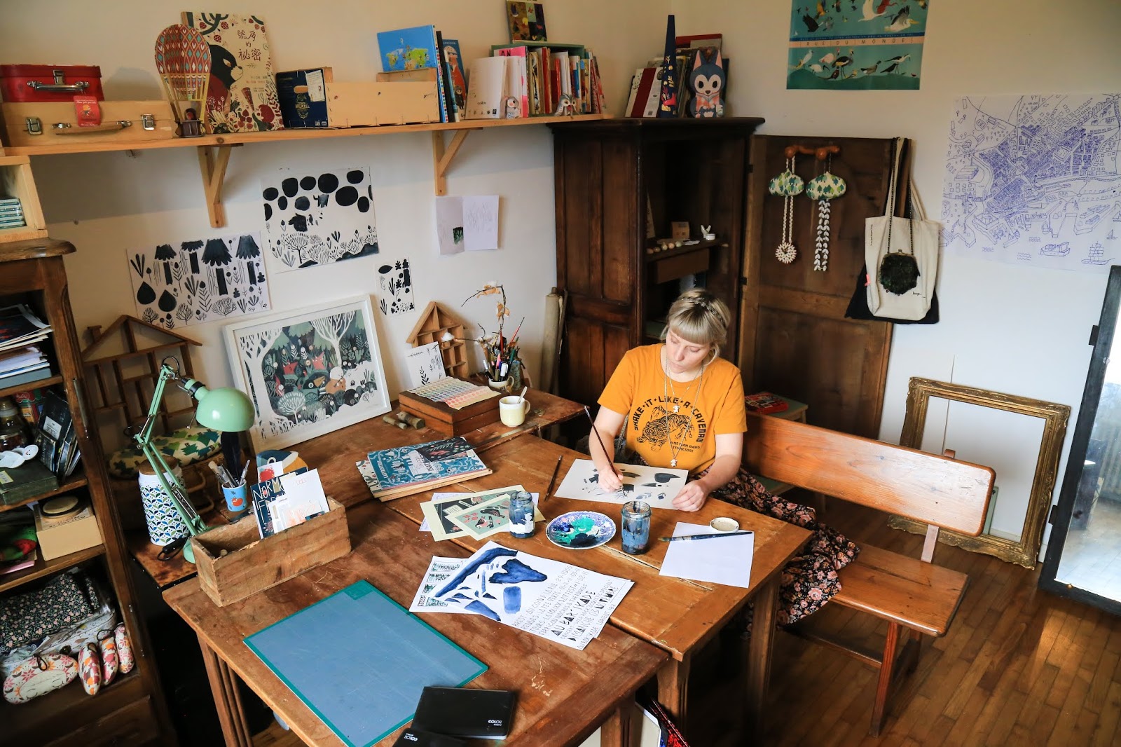 Plusieurs photos en bas de l'article de notre après-midi passé dans l'atelier de Rozenn à Brest vous feront plonger dans ses couleurs, ses livres et son univers quotidien.